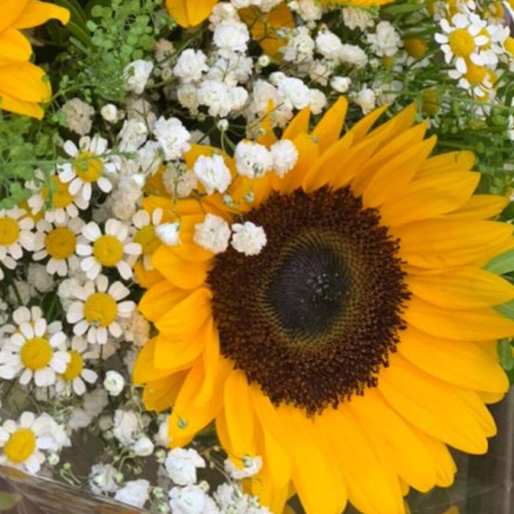 Букет подсолнухов с ромашками ( матрекарией), гипсофилой, тиласпией и зеленью
