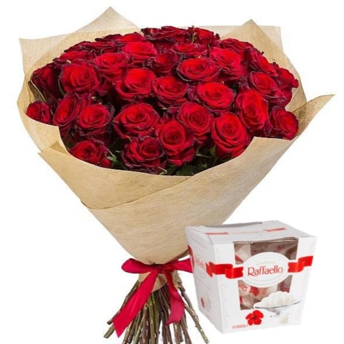 Прекрасный дует- букет красных роз и коробочка конфет Rafaello.