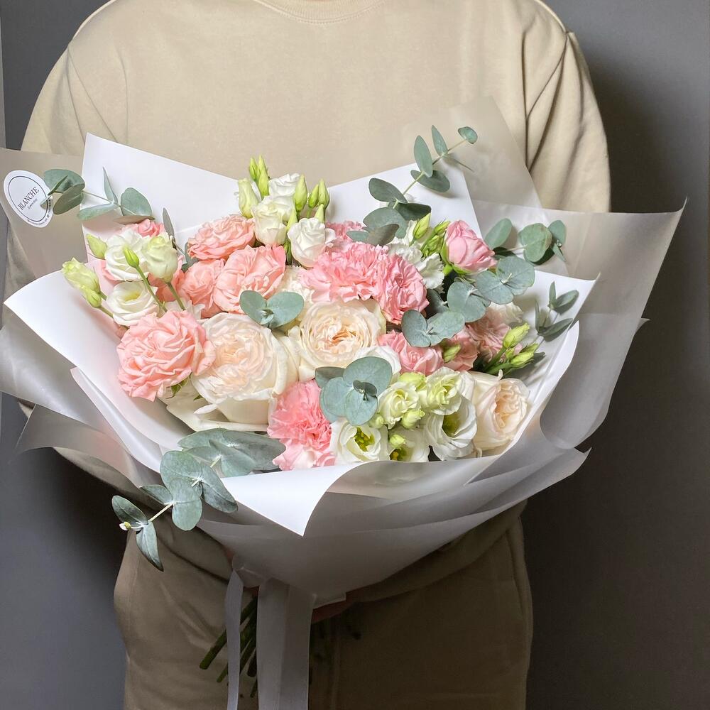 Эвкалипт – 5 шт.Лента атласная – 1 шт.Диантус белый – 2 шт.Диантус розовый – 3 шт.Матовая пленка – 2 шт.Корейская упаковка – 2 шт.лизиантус росита вайт – 3 шт.роза white o’hara – 3 шт.кустовая роза madame bombastic – 2 шт.