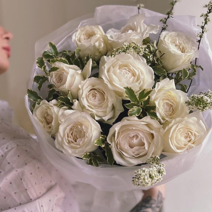 Зелень – 7 шт.Пионовидная роза – 11 шт.Упаковка дизайнерская – 1 шт.