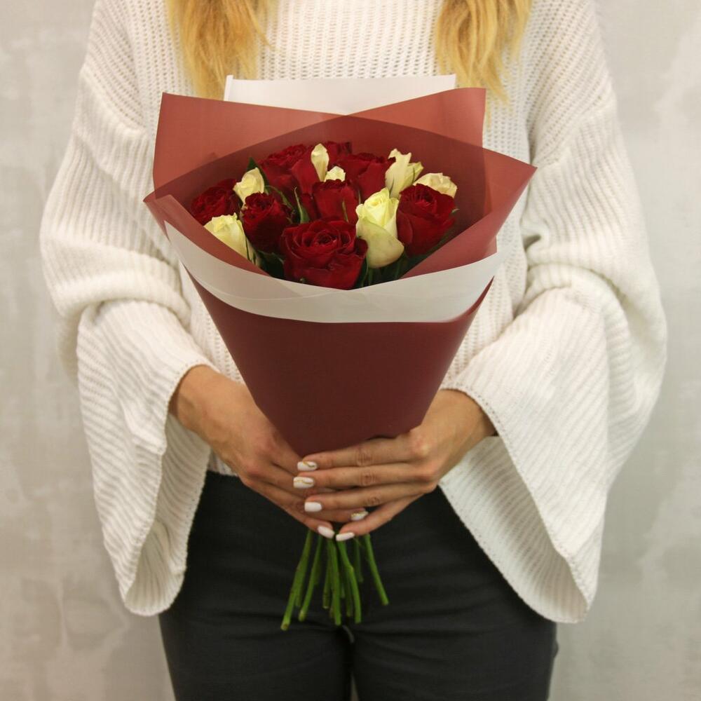Букет из 15 красной и белой розы микс 35-40 см (Кения) в стильной упаковке