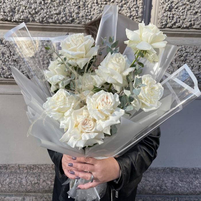 Эвкалипт – 4 шт.Роза – 9 шт.Лента атласная – 2 шт.Упаковка дизайнерская – 6 шт.Ковыль – 1 шт.