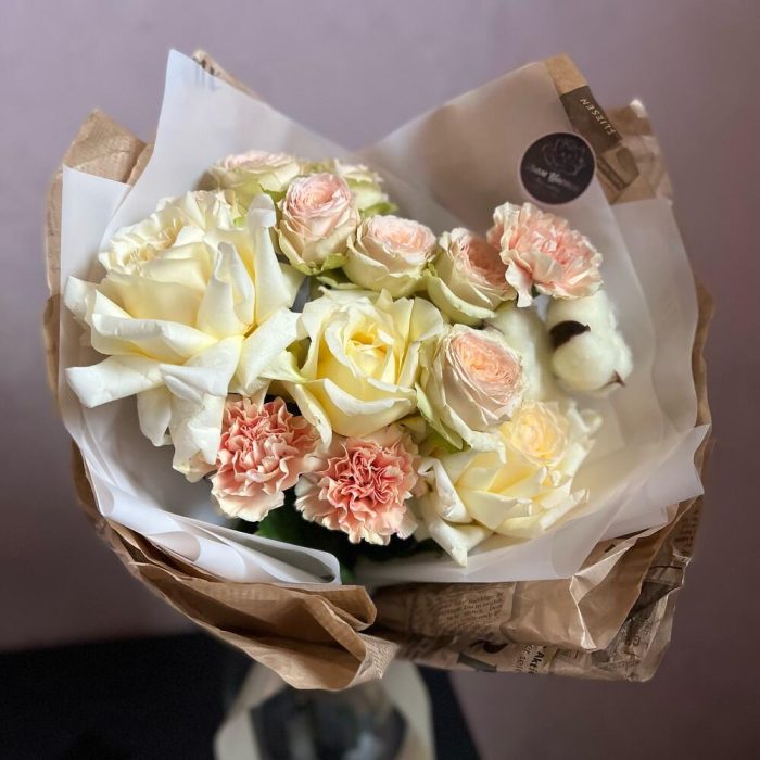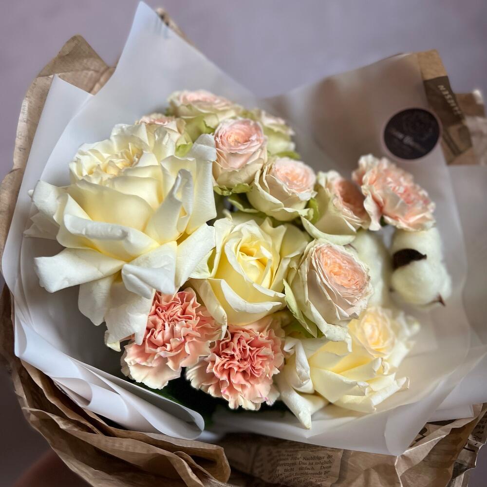роза кендллайт – 3 шт.Кустовая роза – 2 шт.диантусы – 3 шт.Хлопок – 2 шт.декоративная упаковка – 1 шт.Атласная лента – 1 шт.