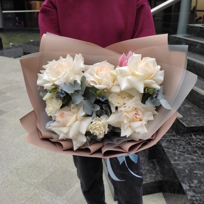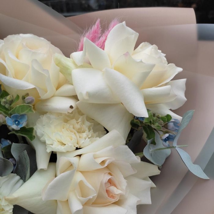 роза вайт о хара( ароматная) – 5 шт.оксипеталум голубой – 3 шт.Диантус белый – 3 шт.Эвкалипт – 1 шт.