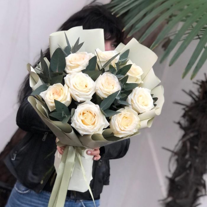 Лента – 2 шт.Эвкалипт – 4 шт.Упаковка дизайнерская – 1 шт.Роза белая эквадор – 9 шт.