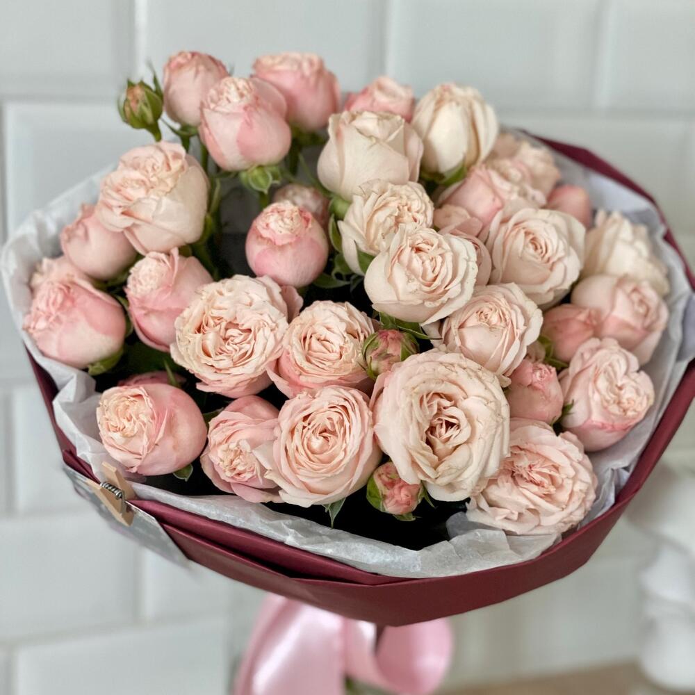 Лента атласная – 1 шт.Тишью – 1 шт.Роза кустовая пионовидная – 7 шт.Упаковка дизайнерская – 2 шт.