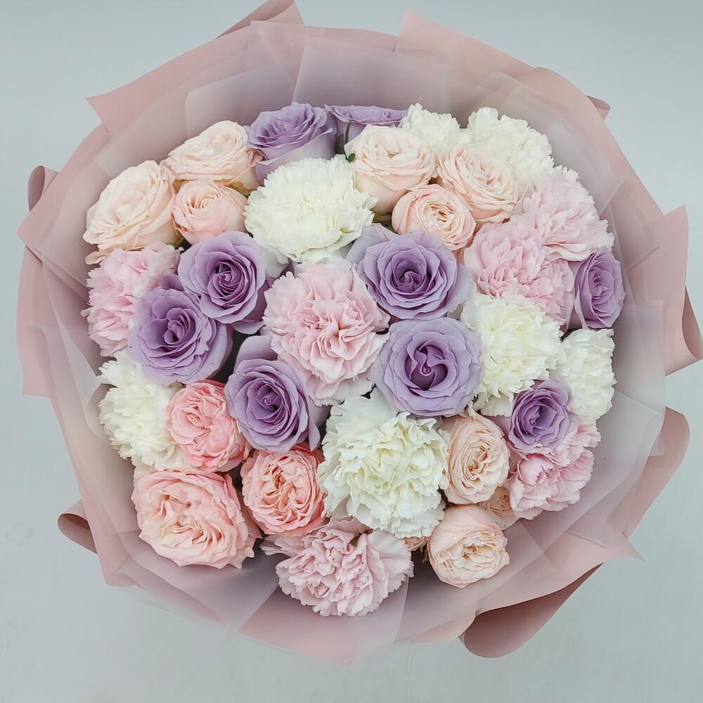 Роза – 9 шт.роза кустовая премиум – 4 шт.гвоздика сортовая (диантус) – 13 шт.Пистация – 5 шт.Упаковка дизайнерская – 1 шт.