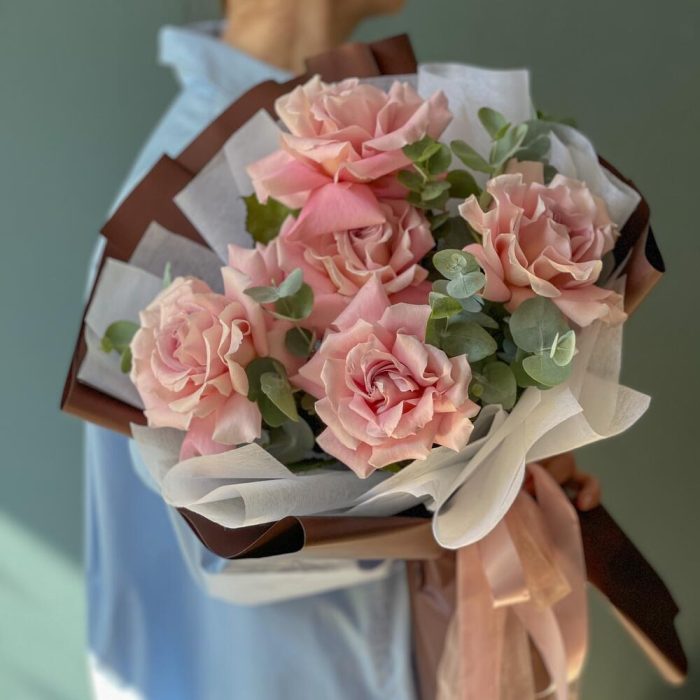 Лента – 2 шт.Эвкалипт – 2 шт.Роза одноголовая – 5 шт.Упаковка дизайнерская – 2 шт.