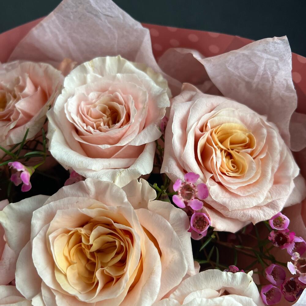 Букет с пионовидными розами и хамелациум