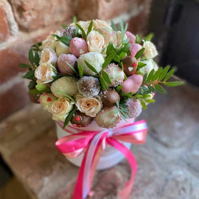 Композиция из клубники в шоколаде, мяты и кустовых роз “Эвредика”