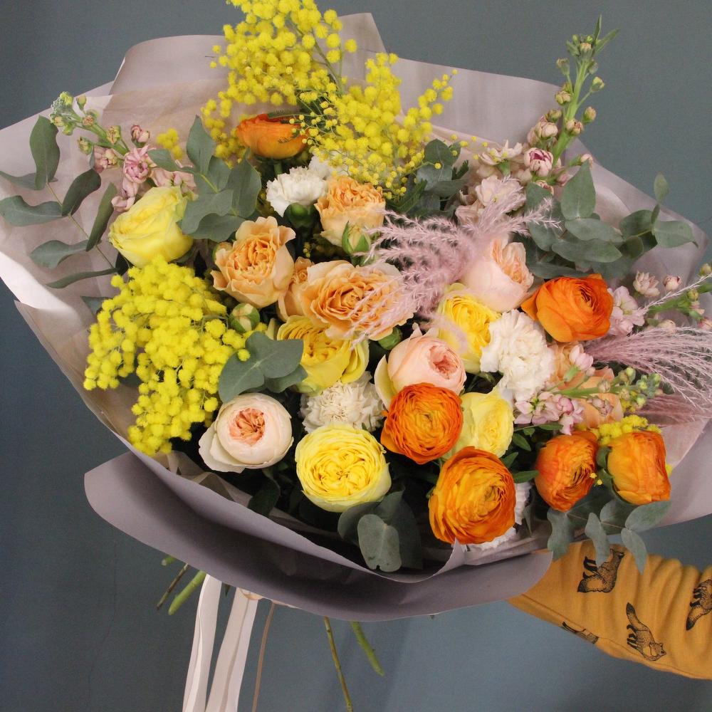 Сухоцветы – 2 шт.Роза кустовая пионовидная – 3 шт.Роза пионовидная – 7 шт.Маттиола – 3 шт.Ранункулюс – 5 шт.Диантус – 5 шт.Эвкалипт – 5 шт.Фисташка – 3 шт.Лента атласная – 3 шт.Упаковка дизайнерская – 3 шт.Мимоза – 2 шт.