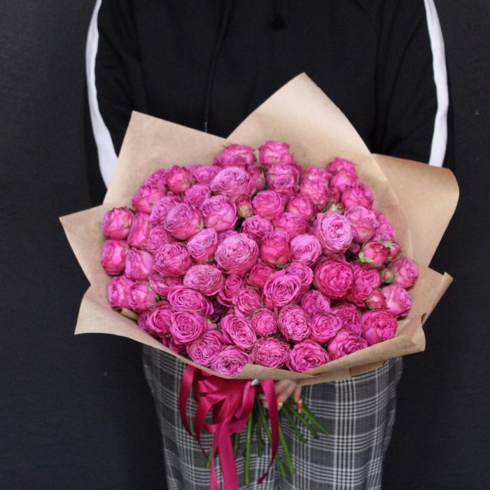 Пионовидная кустовая роза – 21 шт.Крафт упаковка – 2 шт.Лента атласная – 2 шт.