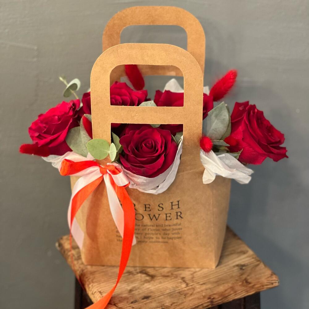 Эвкалипт – 7 шт.Лента атласная – 2 шт.Лагурус – 5 шт.Оазис флористический – 1 шт.Тишью белое – 5 шт.пленка транспортировочная – 1 шт.розы красные – 5 шт.работа флориста – 1 шт.